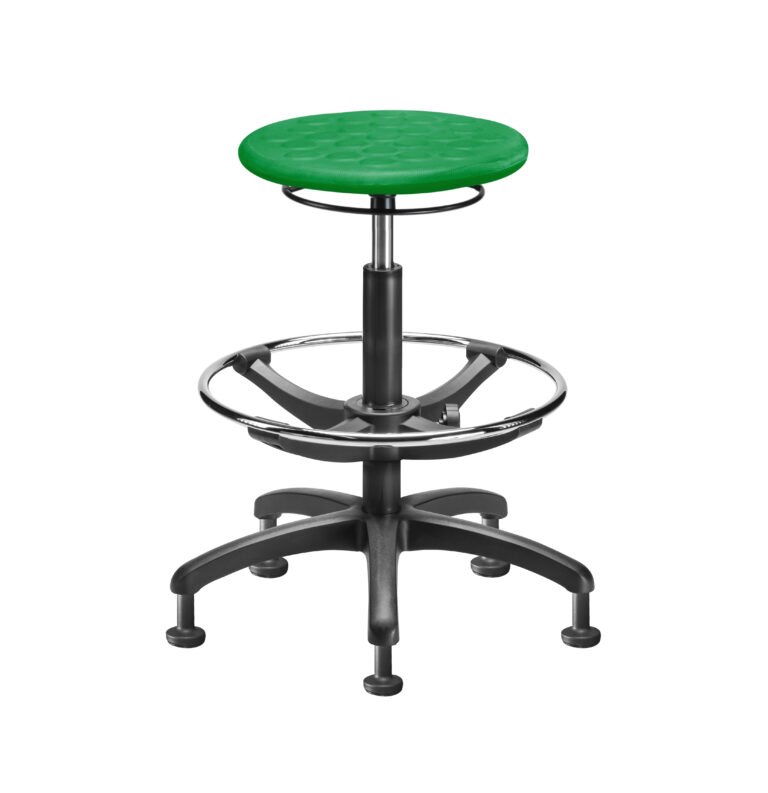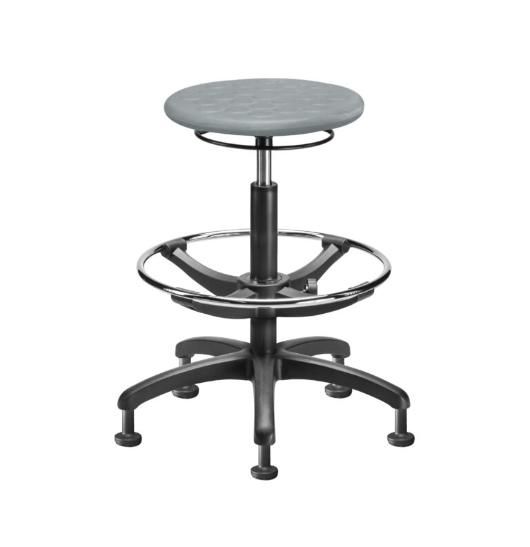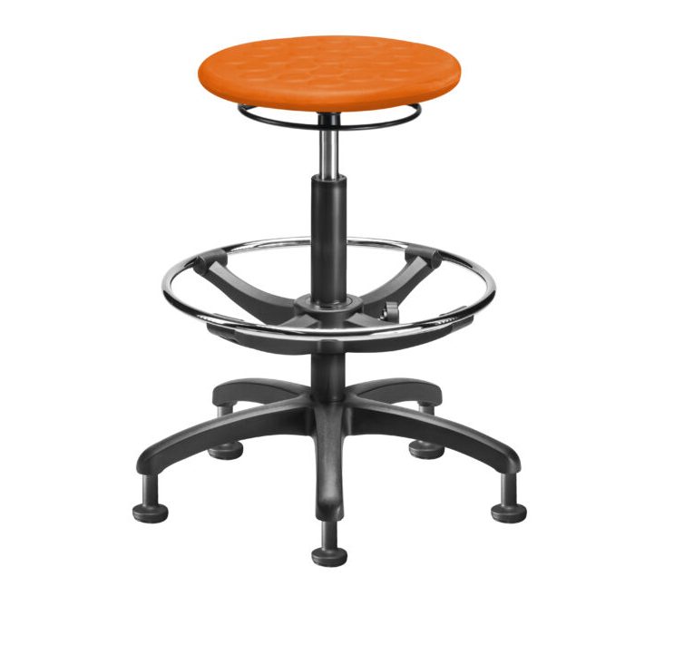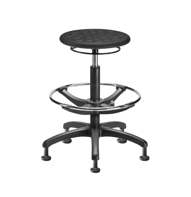 Banco giratorio 1900 A, asiento redondo de poliuretano piel integral, mecanismo de ajuste neumático de altura, base de 5 puntas con regatones o rodajas y aro descansapiés.