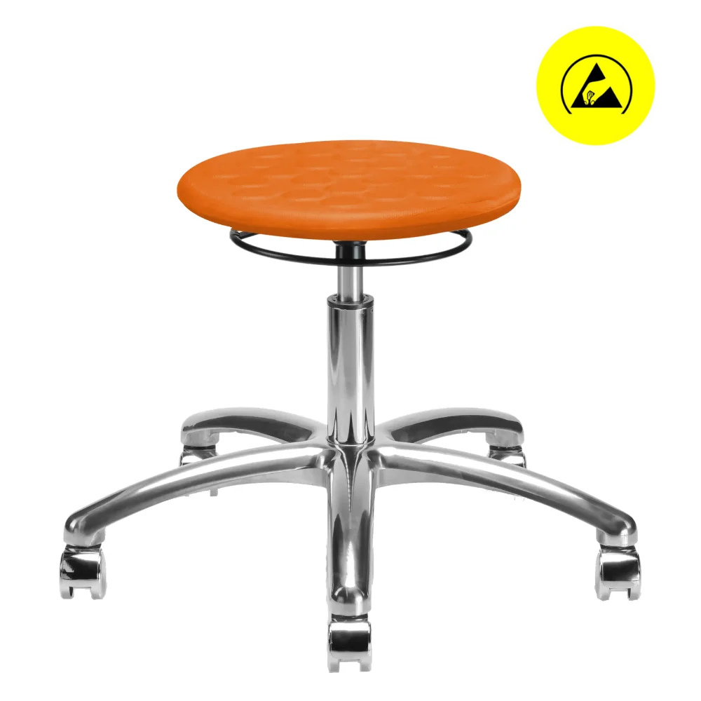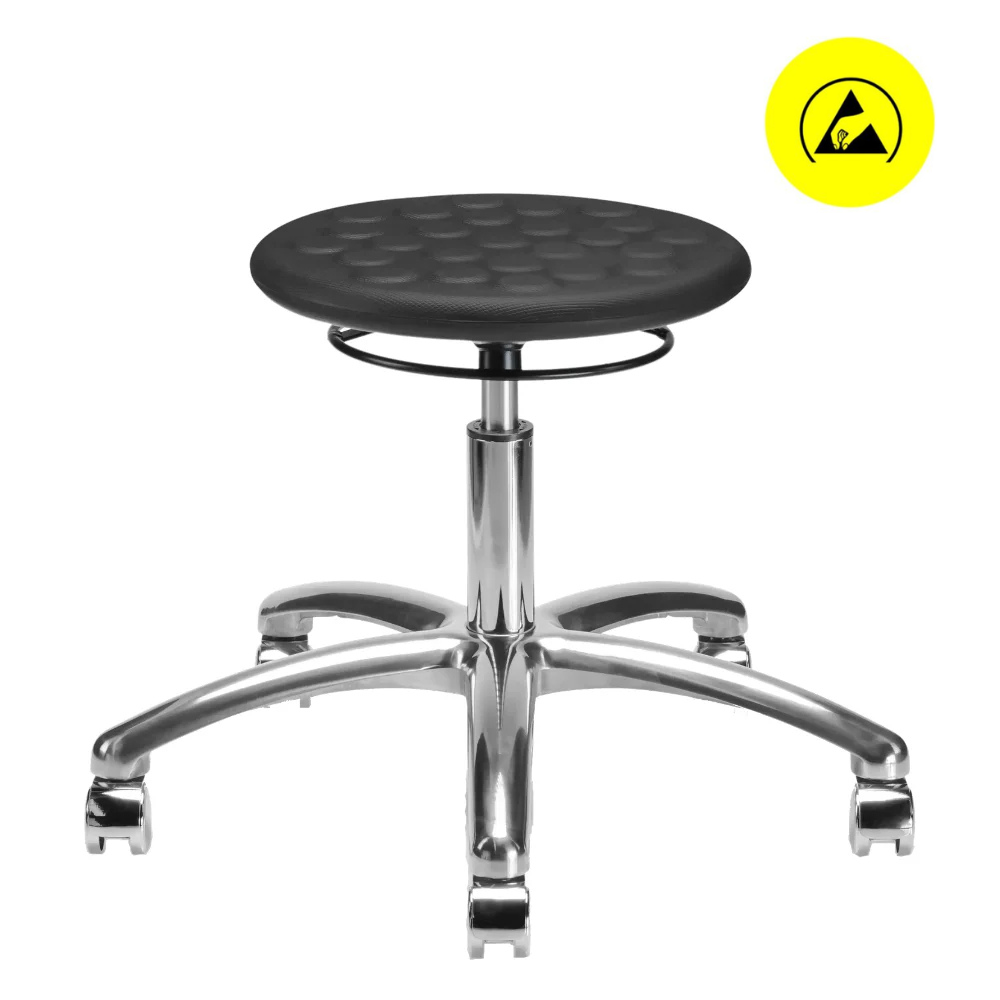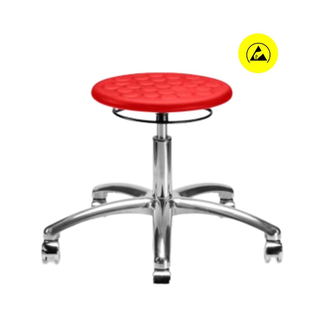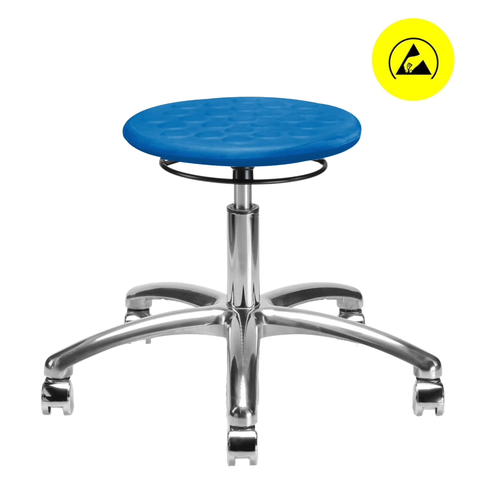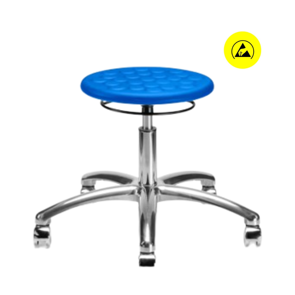 Banco giratorio 1902 B ESD, asiento redondo de poliuretano tipo piel integral, mecanismo de ajuste neumático de altura, base de 5 anclas con regatones o rodajas.