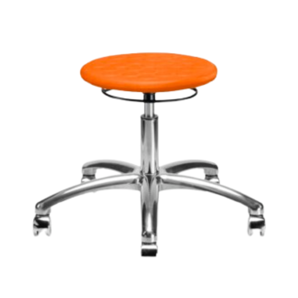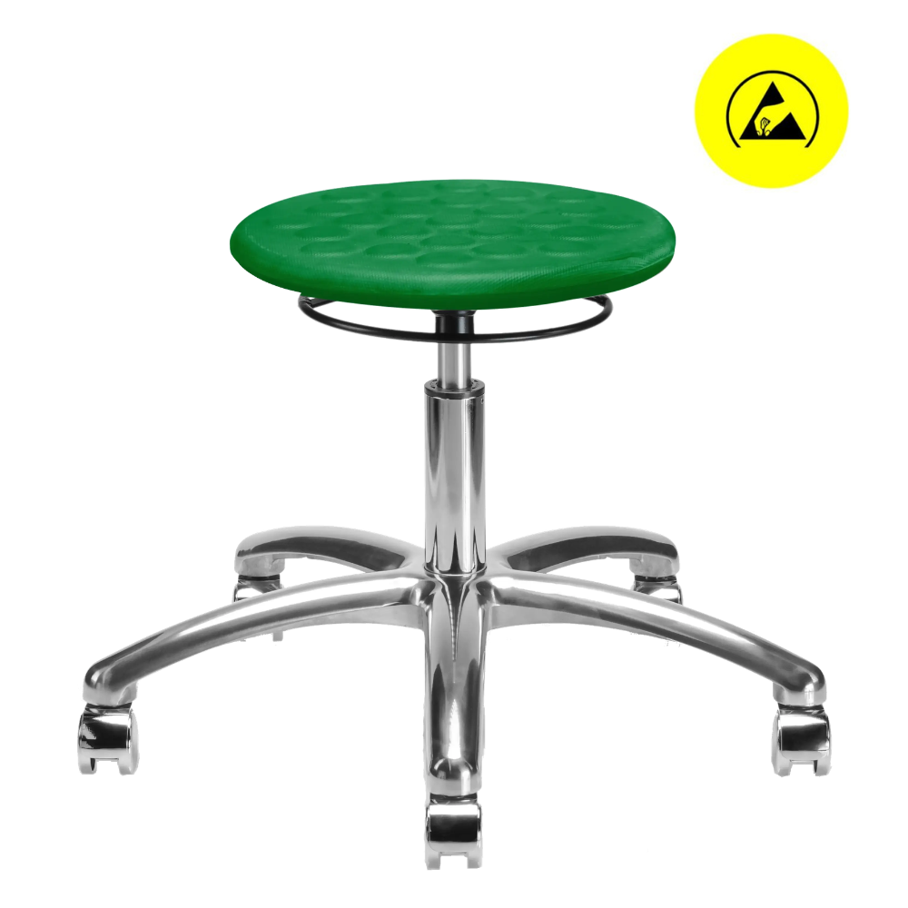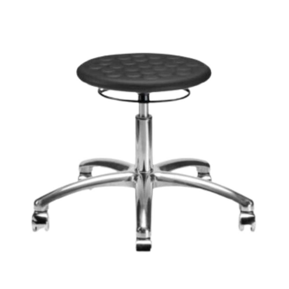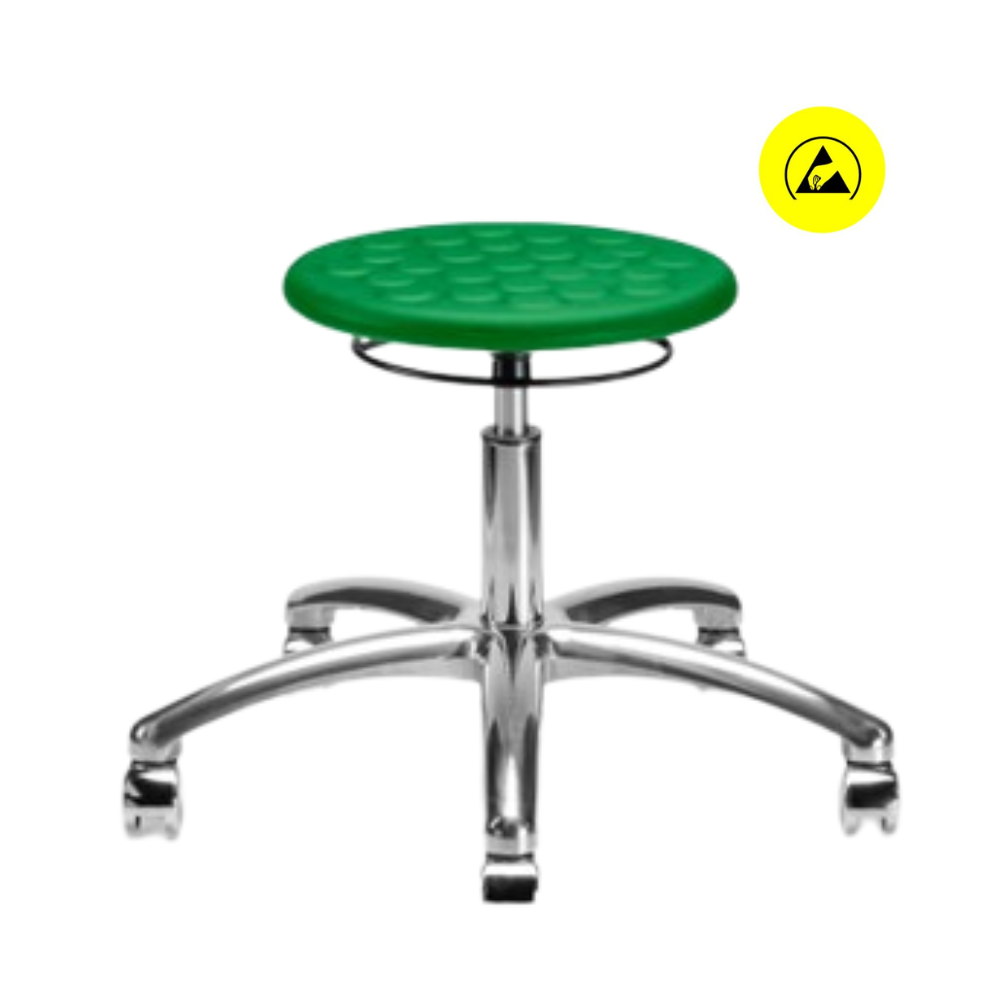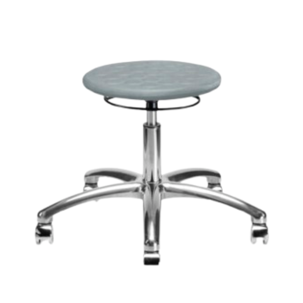 Banco giratorio 1902 B ESD, asiento redondo de poliuretano tipo piel integral, mecanismo de ajuste neumático de altura, base de 5 anclas con regatones o rodajas.