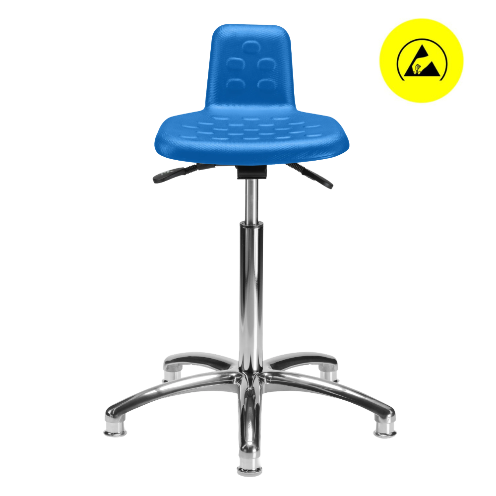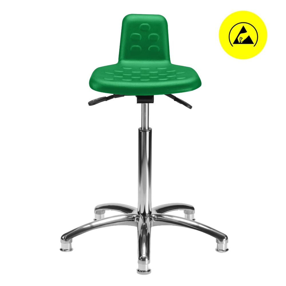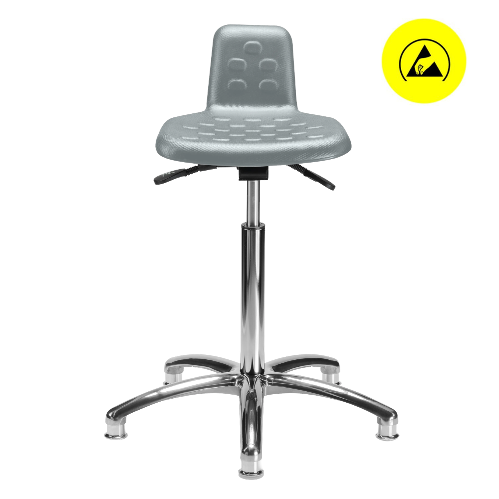 Banco giratorio 1918 A ESD, asiento de poliuretano tipo piel integral ESD, mecanismo de reclinación de asiento, ajuste neumático de altura y base de 5 anclas con regatones ESD.