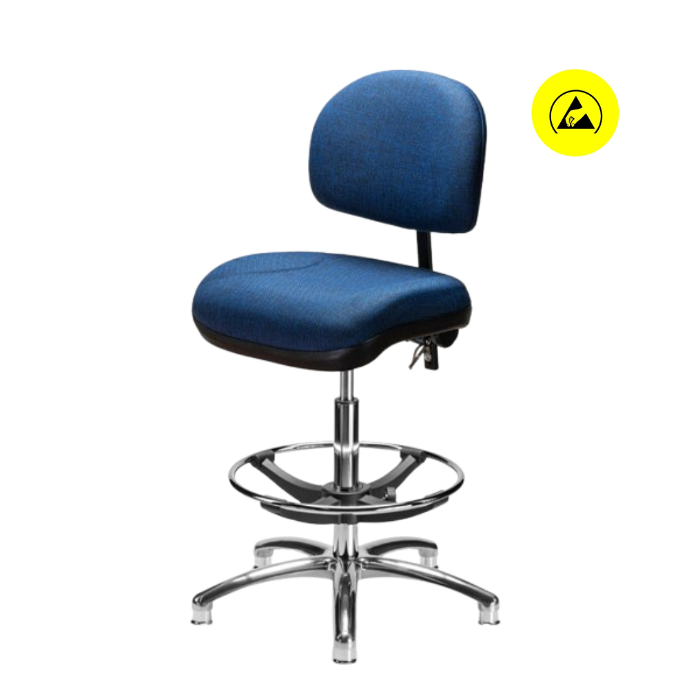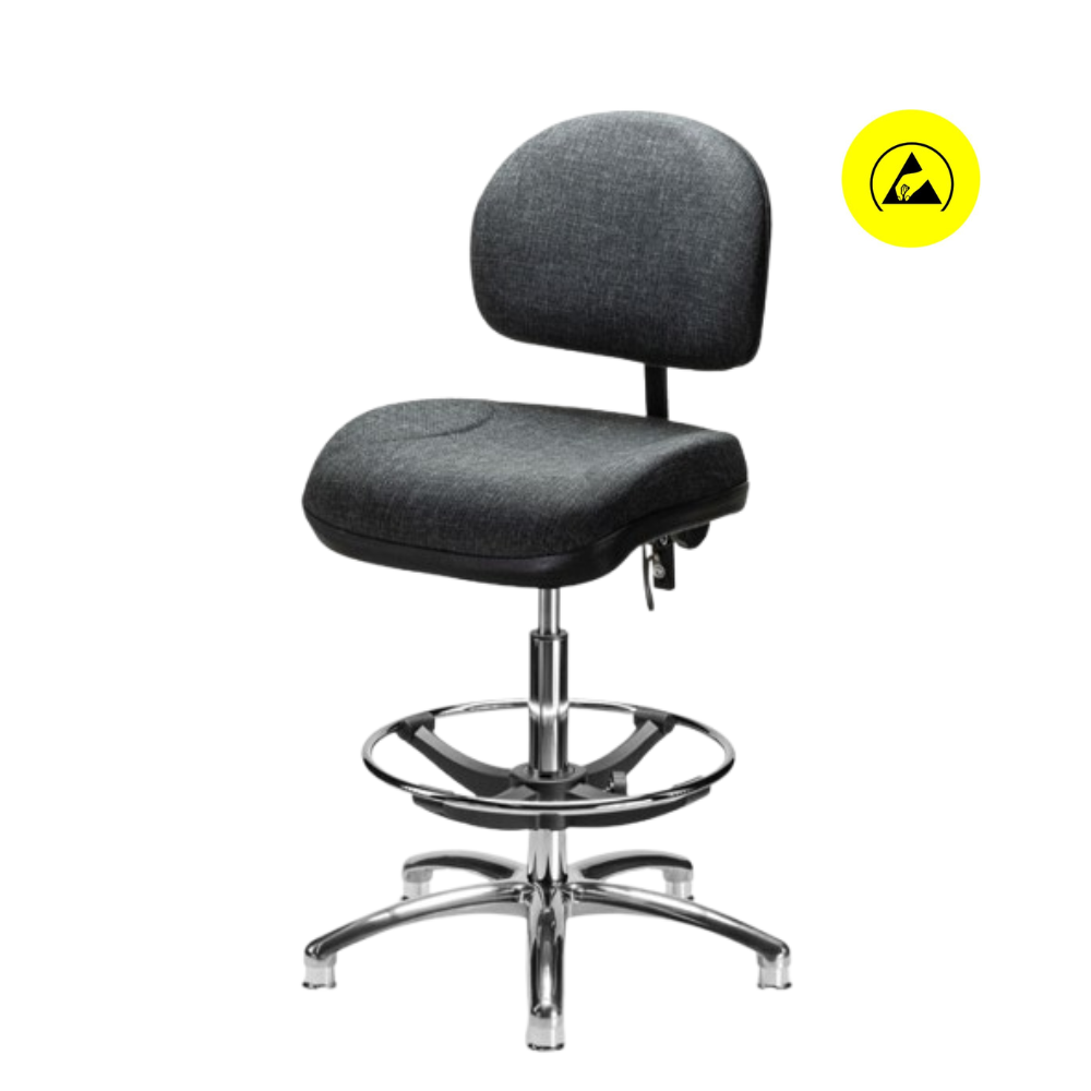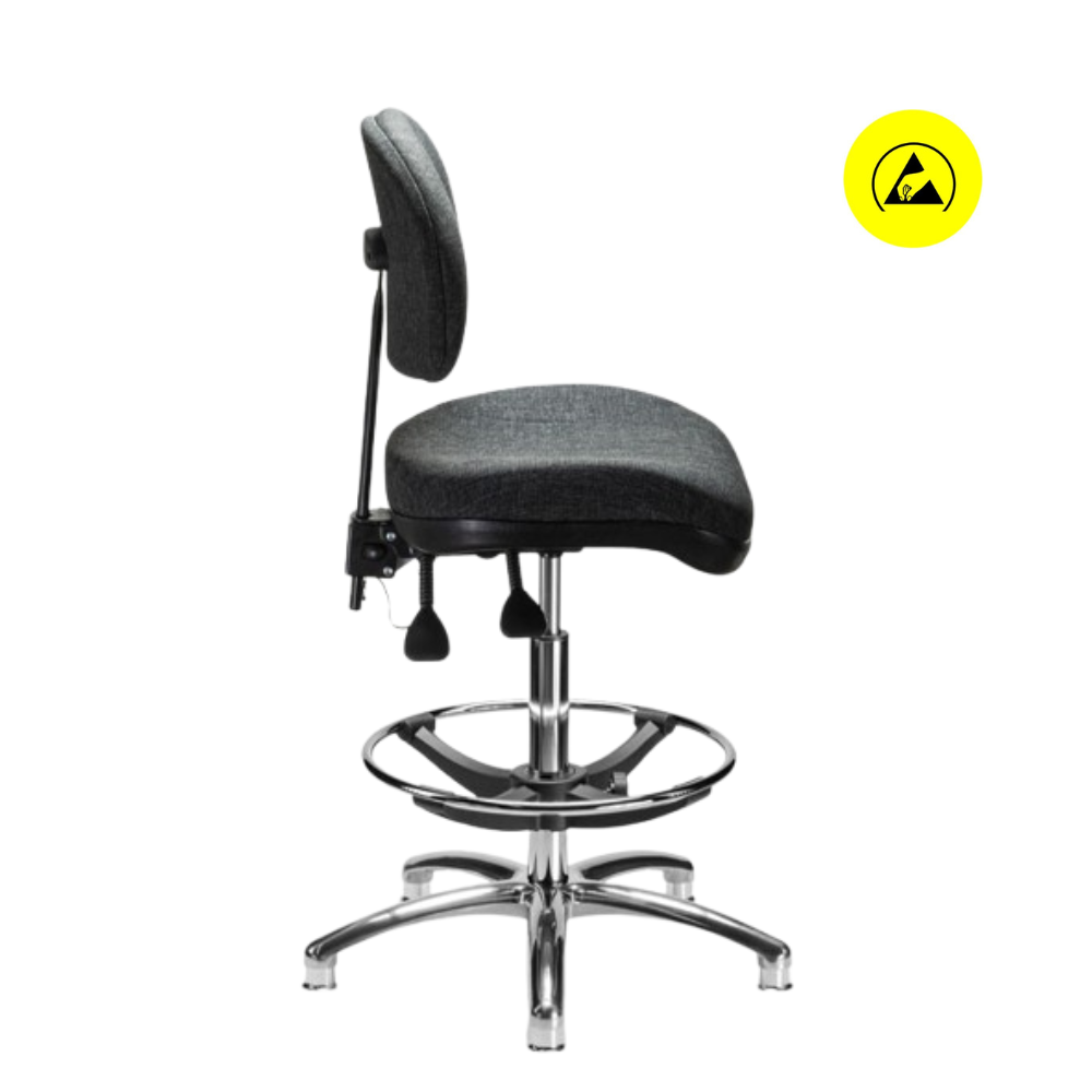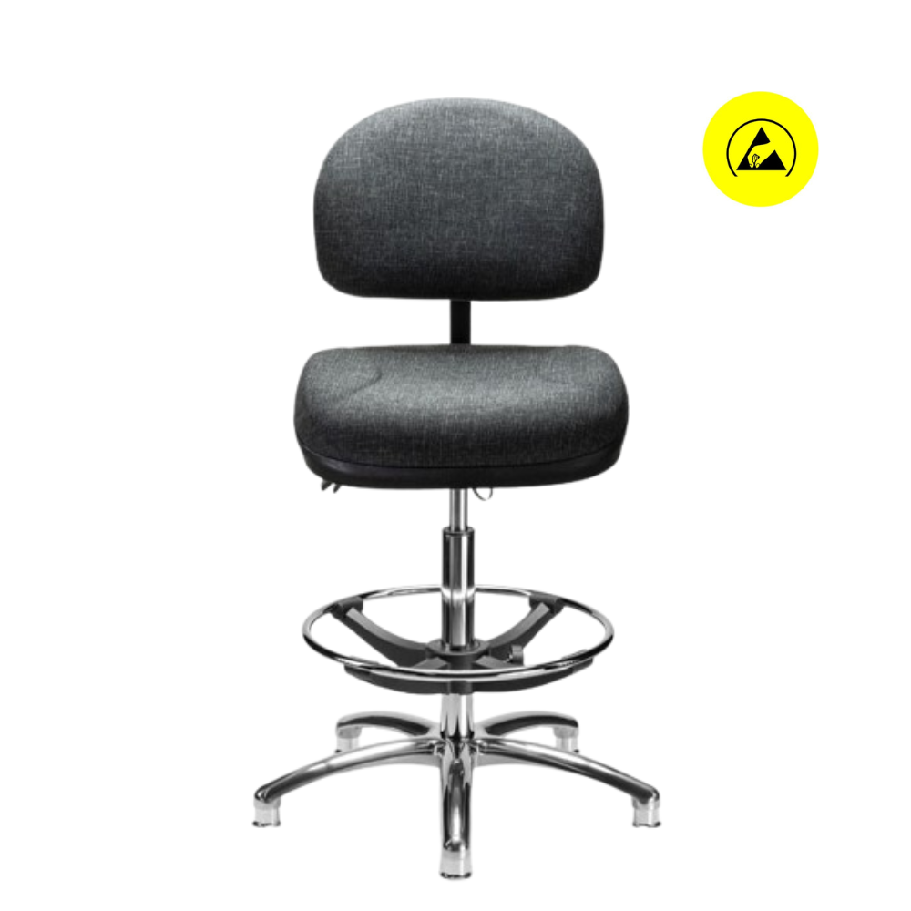 Silla giratoria de respaldo bajo 1932 A ESD, pistón neumático de ajuste de altura, ajuste de altura y reclinación de respaldo, acojinados de asiento y respaldo tapizados en tela antiestática, base de 5 brazos con regatones y aro descansapiés.- Silla giratoria industrial/ensamble electrónico.