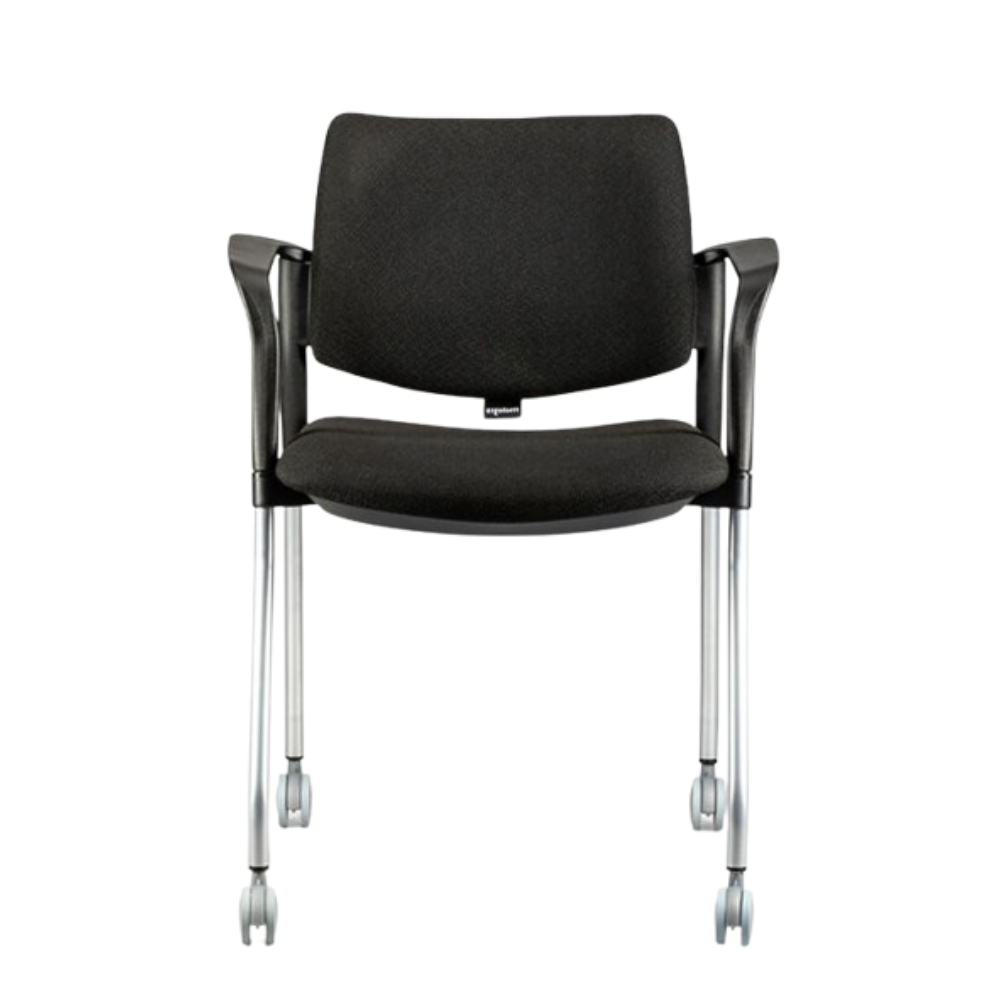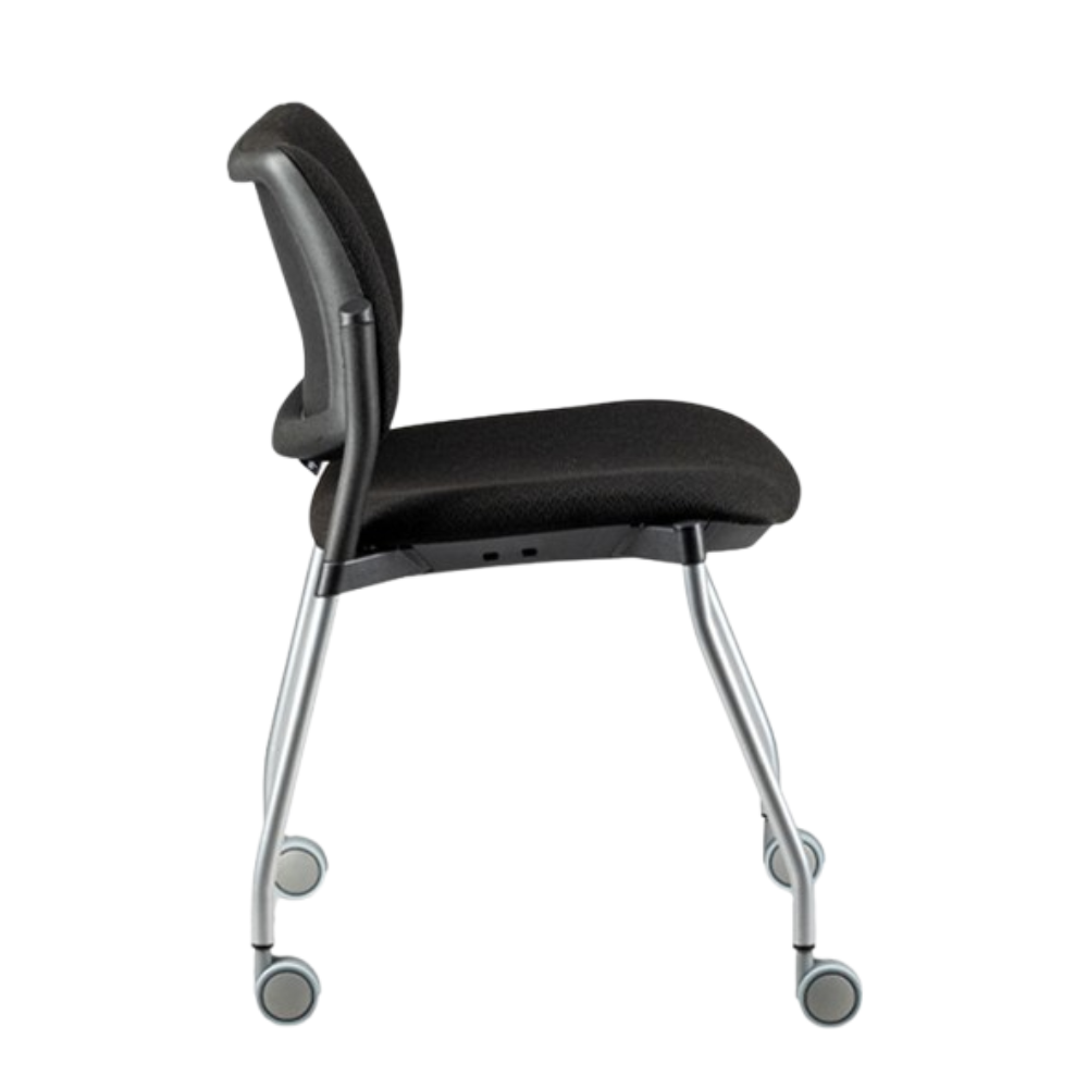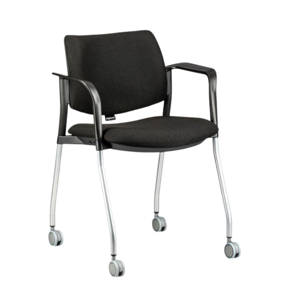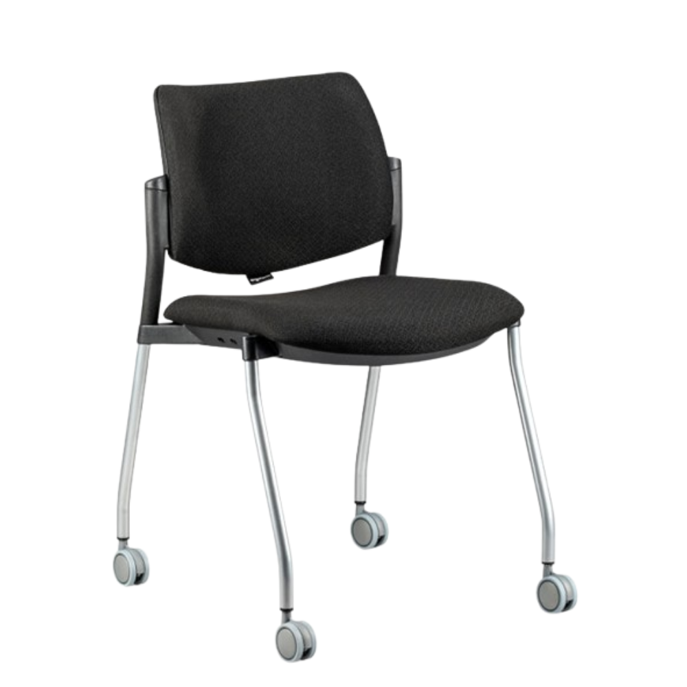 Silla apilable 5063 de 4 patas con rodajas, respaldo y asiento de polipropileno, tapizados en tela poliéster, base tubular gris.- Silla para visita con rodajas.