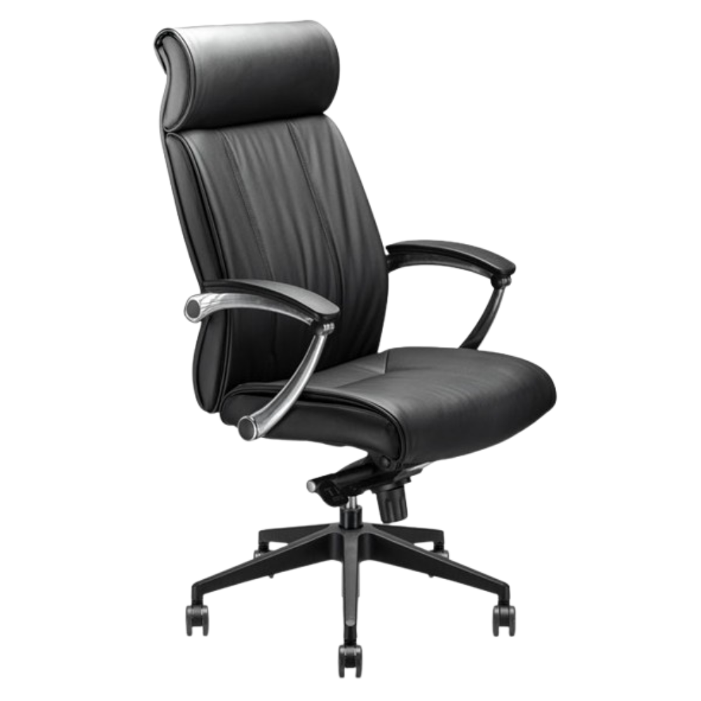 Sillón giratorio 2498 C, de respaldo alto con pistón neumático de ajuste de altura, mecanismo Knee Tilt Synchro (tipo rodilla) acojinados de asiento y respaldo de espuma de poliuretano moldeado, coderas, base 5 brazos con rodajas para alfombra.