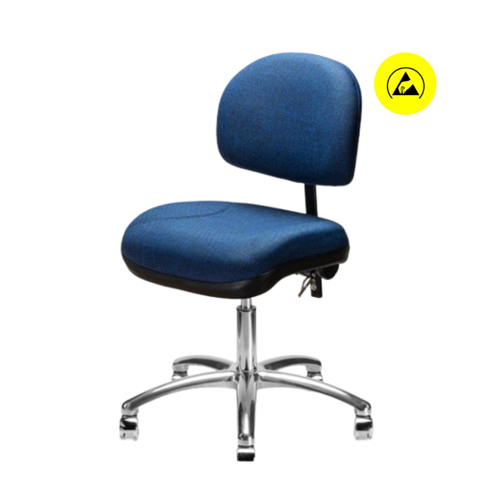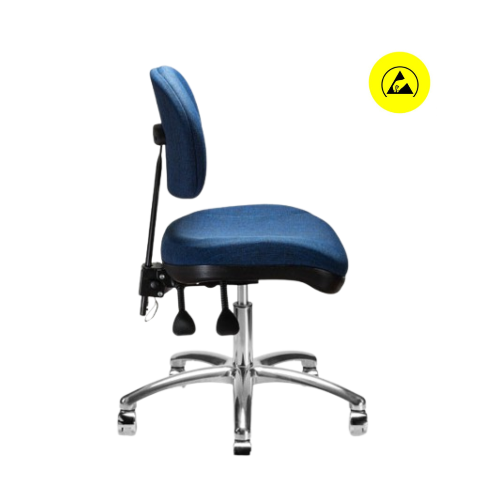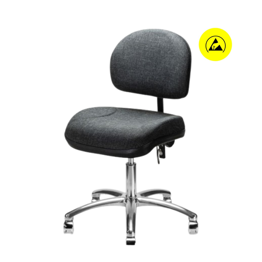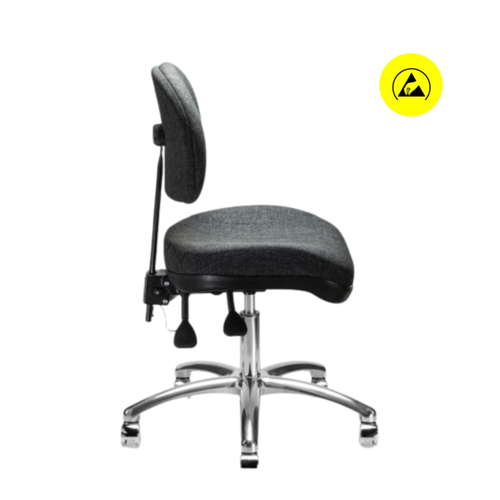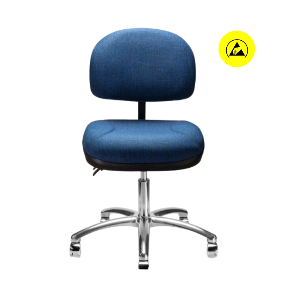 Silla 1932 B giratoria de respaldo bajo, pistón neumático de ajuste de altura, ajuste de altura y reclinación de respaldo, acojinados de asiento y respaldo tapizados en tela antiestática y base de 5 brazos con regatones.- Silla giratoria industrial/ensamble electrónico.