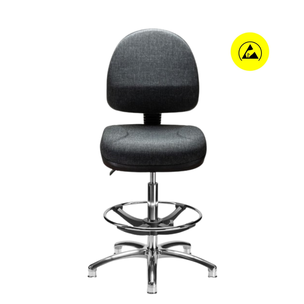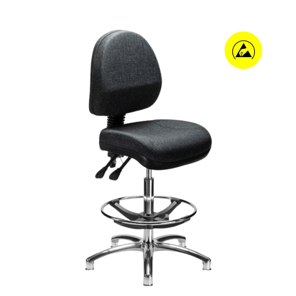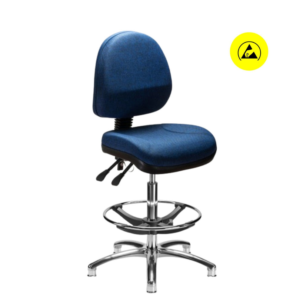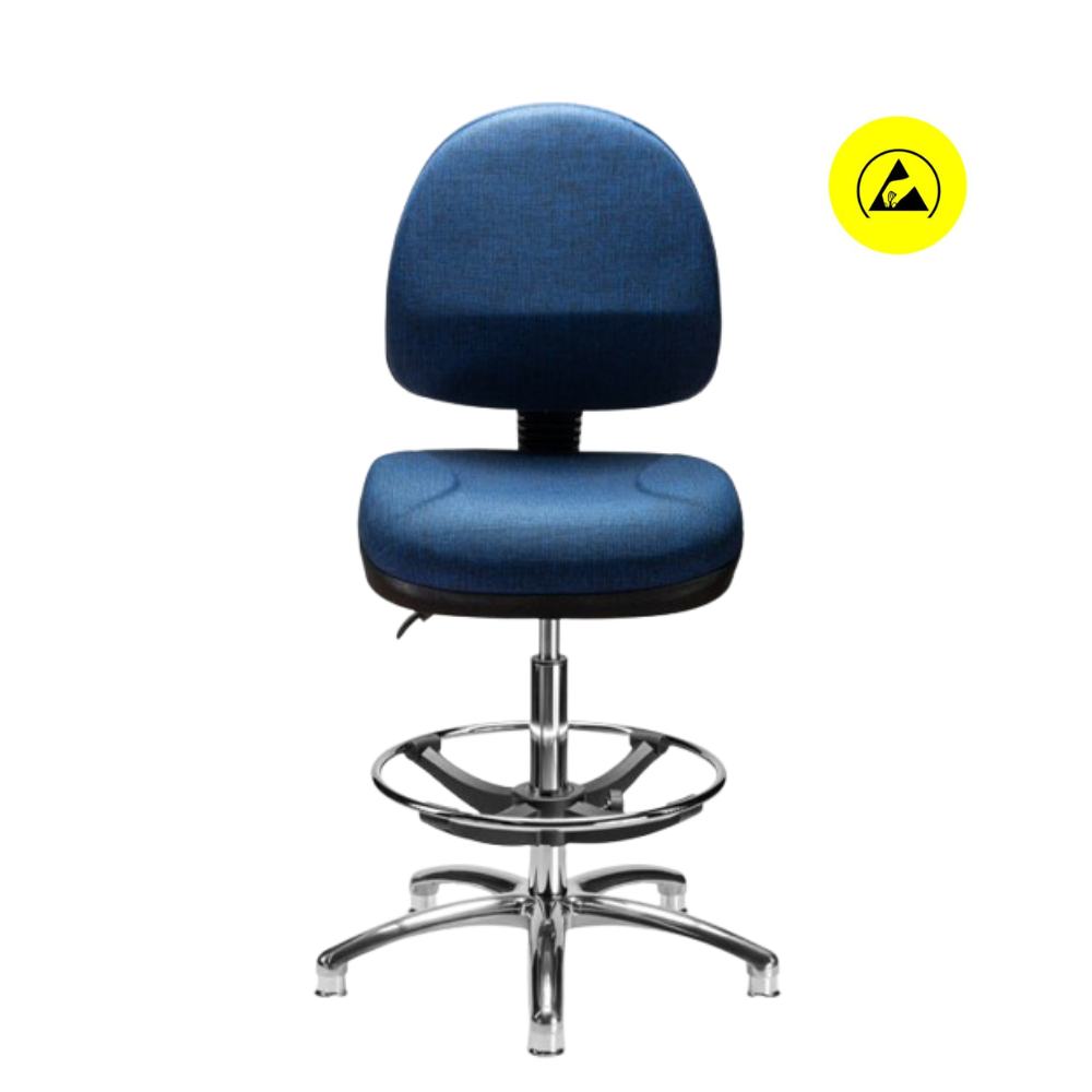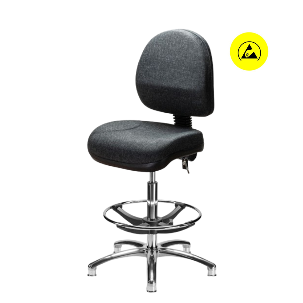 Silla giratoria de respaldo medio 1942 A ESD, pistón neumático de ajuste de altura, ajuste de altura y reclinación de respaldo, acojinados de asiento y respaldo tapizados en tela antiestática, base de 5 brazos con regatones y aro descansapiés.