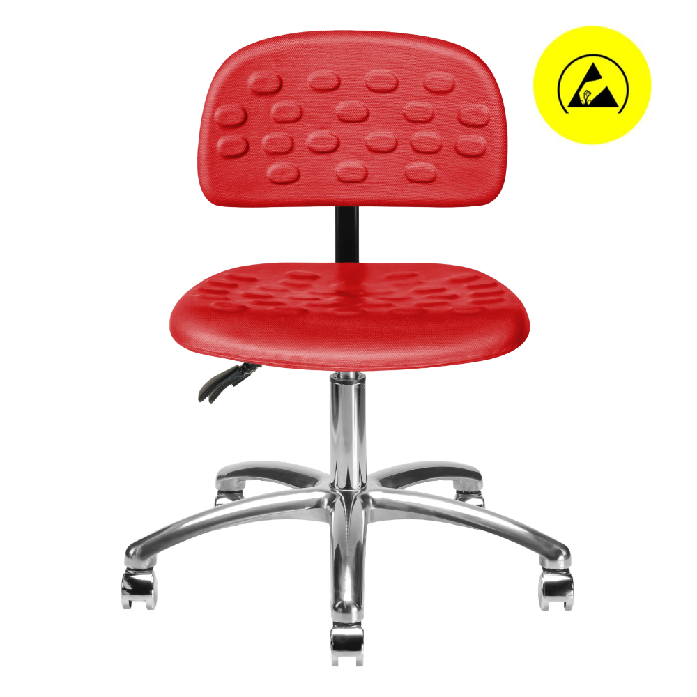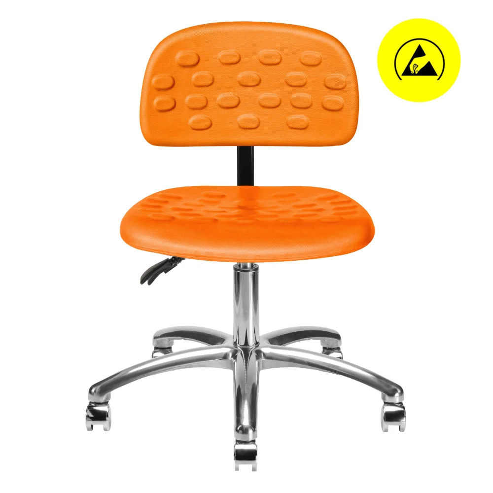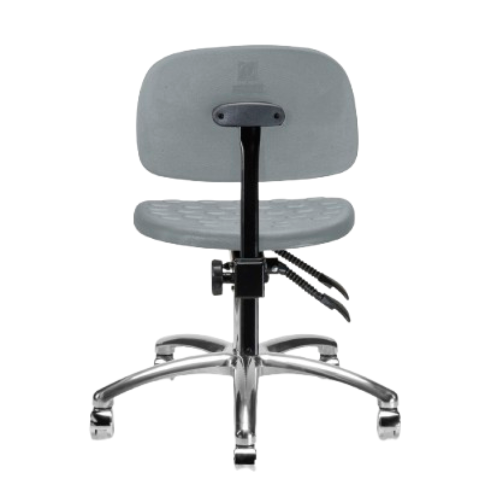 Silla giratoria 1912 B ESD, respaldo y asiento moldeados de poliuretano tipo piel integral, mecanismo de reclinación de respaldo, ajuste neumático de altura y base de 5 anclas con regatones o rodajas.