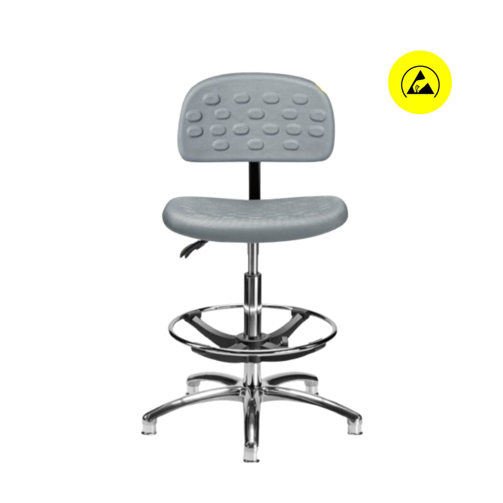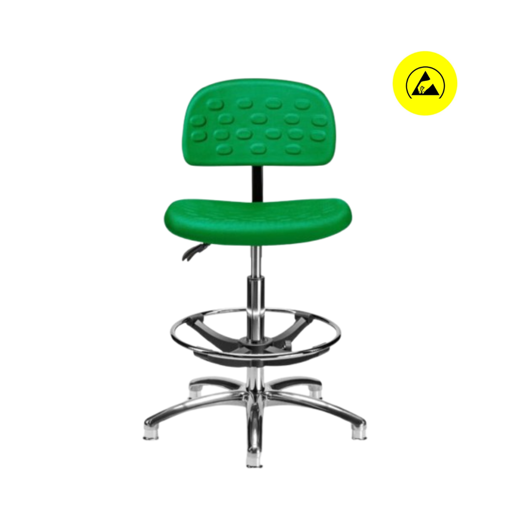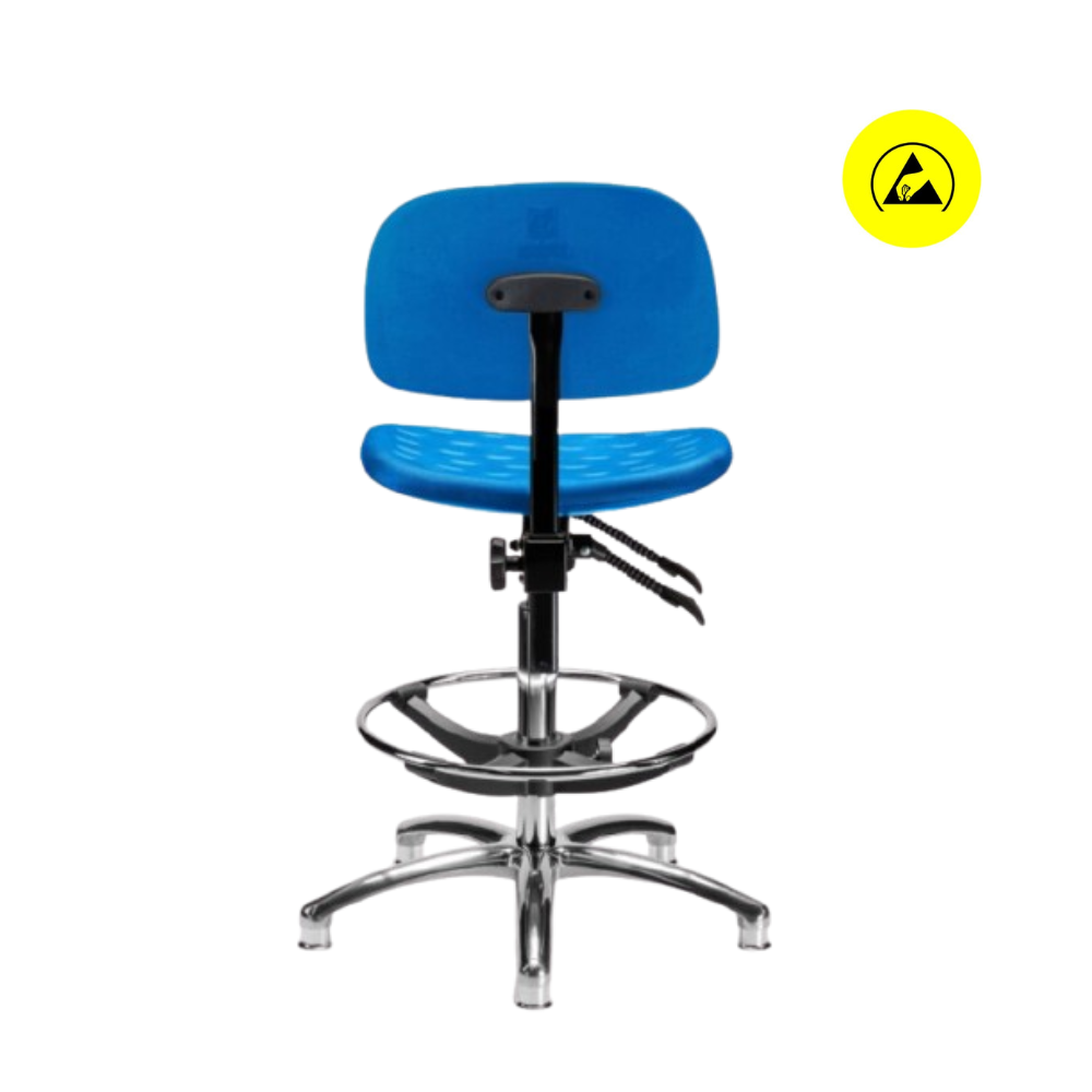 Silla giratoria 1914 A ESD, respaldo y asiento moldeados de poliuretano tipo piel integral, mecanismo de reclinación de respaldo, ajuste neumático de altura, base de 5 puntas con regatones o rodajas y aro descansapiés.