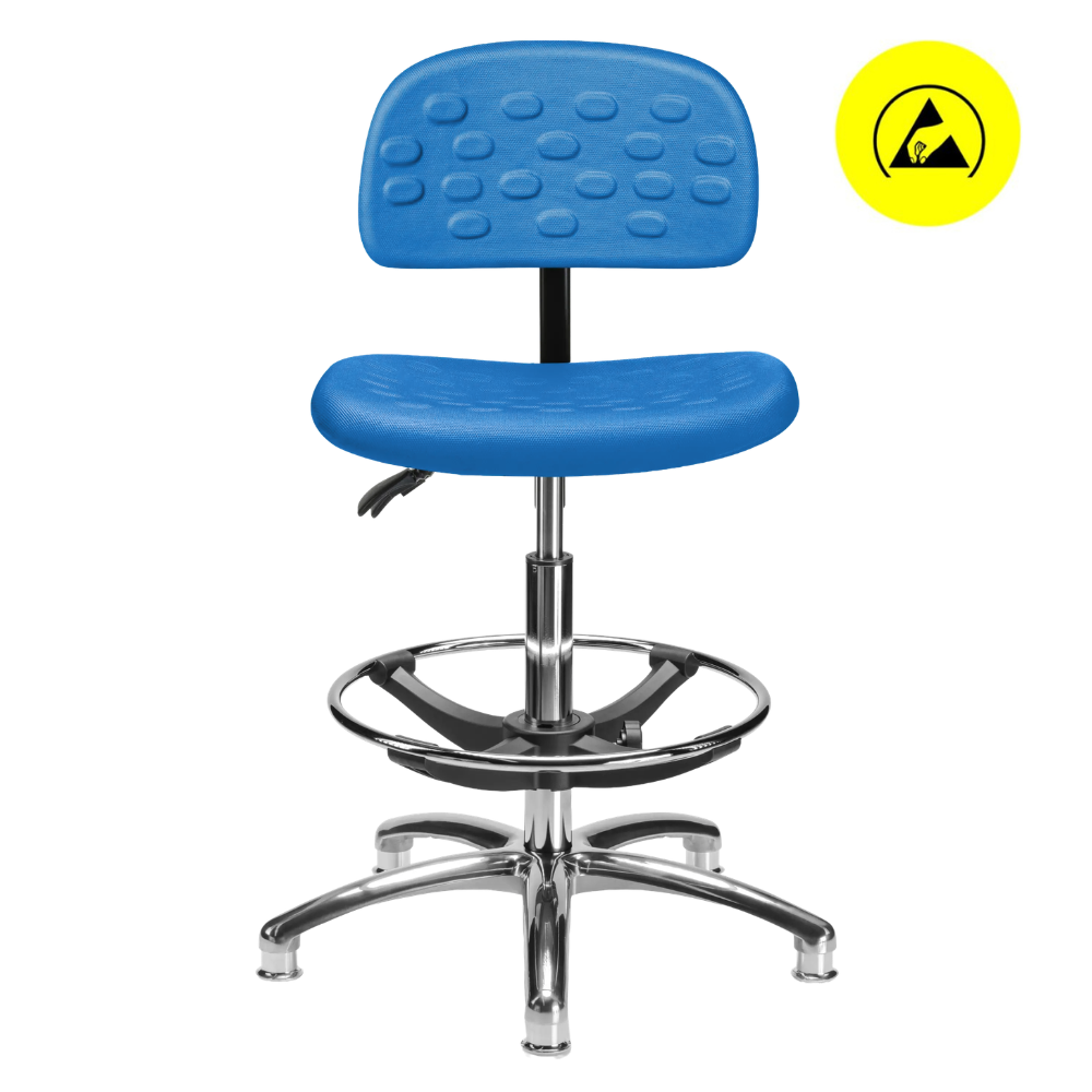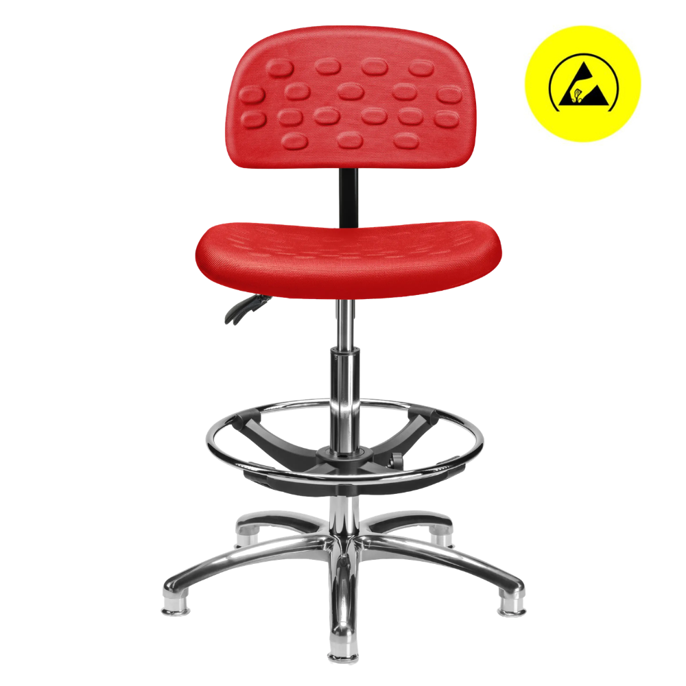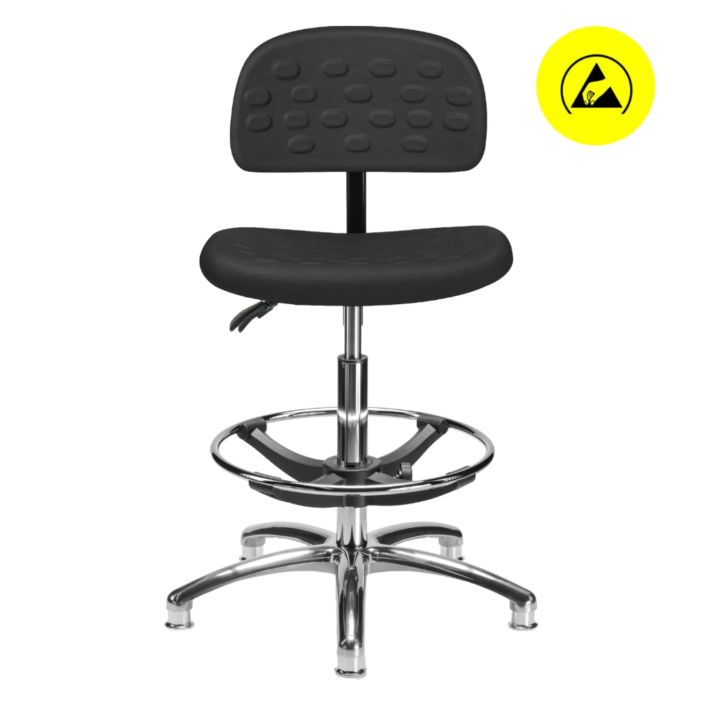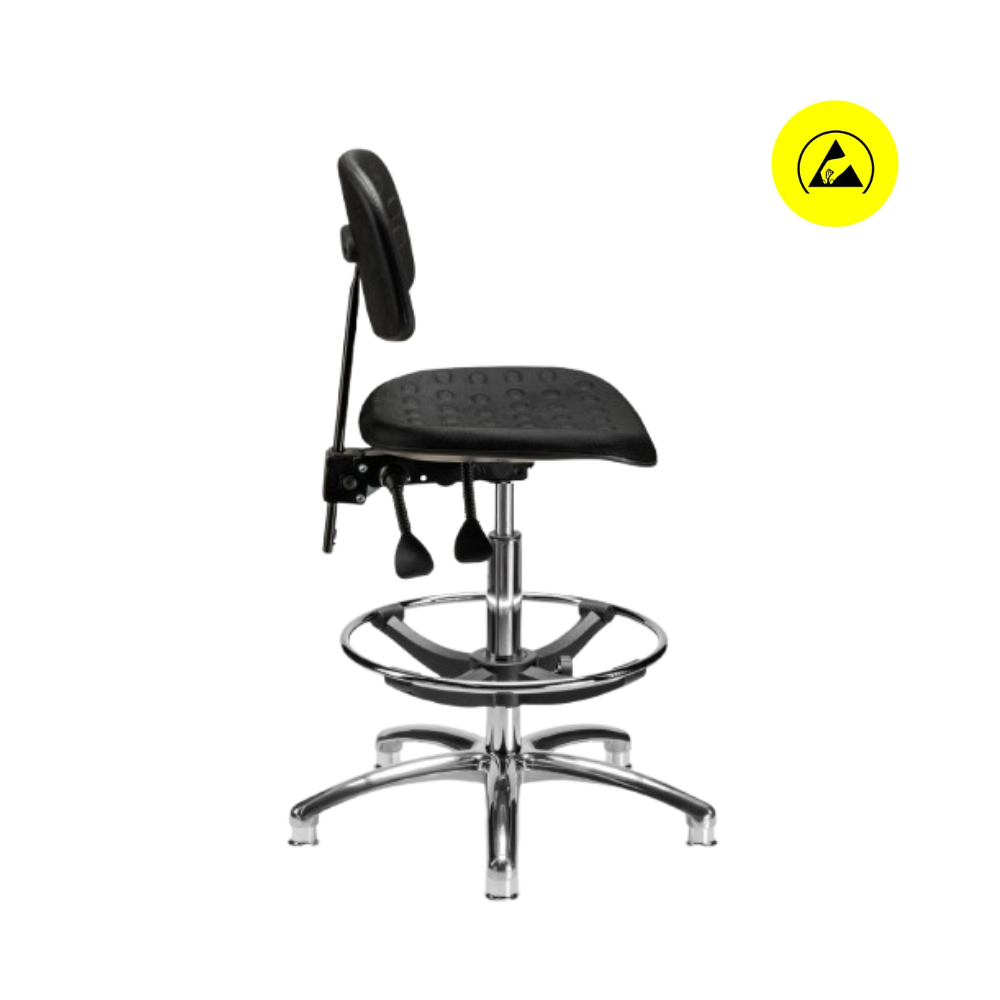 Silla giratoria 1914 A ESD, respaldo y asiento moldeados de poliuretano tipo piel integral, mecanismo de reclinación de respaldo, ajuste neumático de altura, base de 5 puntas con regatones o rodajas y aro descansapiés.