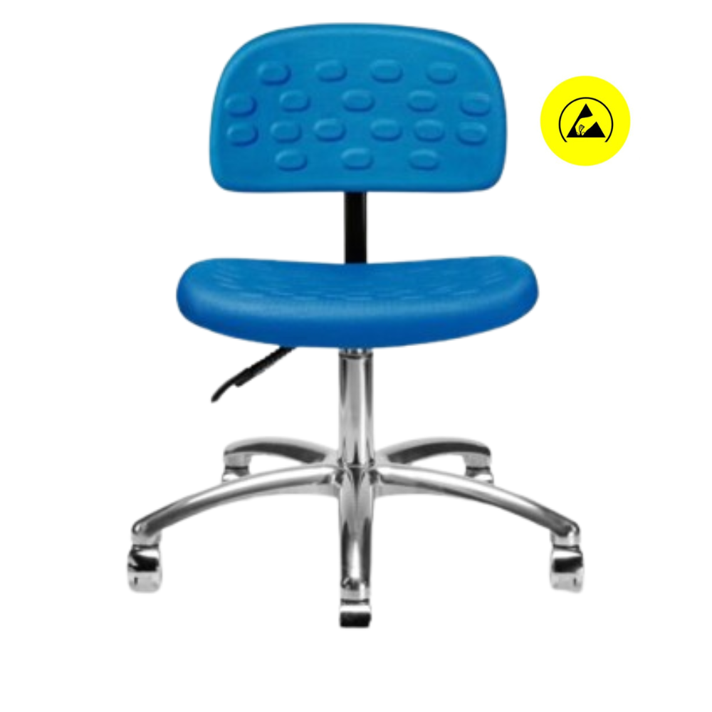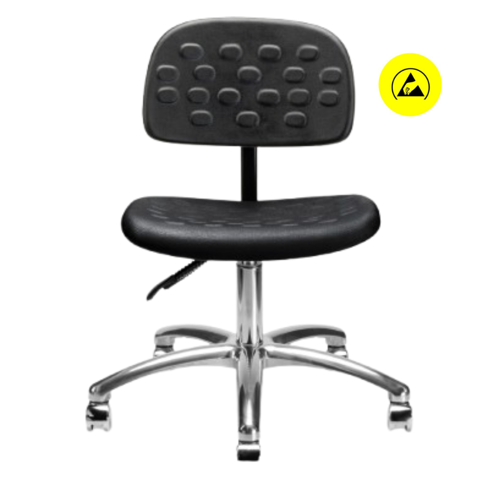 Silla giratoria 1914 B ESD, respaldo y asiento moldeados de poliuretano tipo piel integral, mecanismo de reclinación de respaldo, ajuste neumático de altura, base de 5 puntas con regatones o rodajas y aro descansapiés.