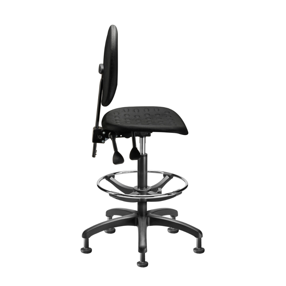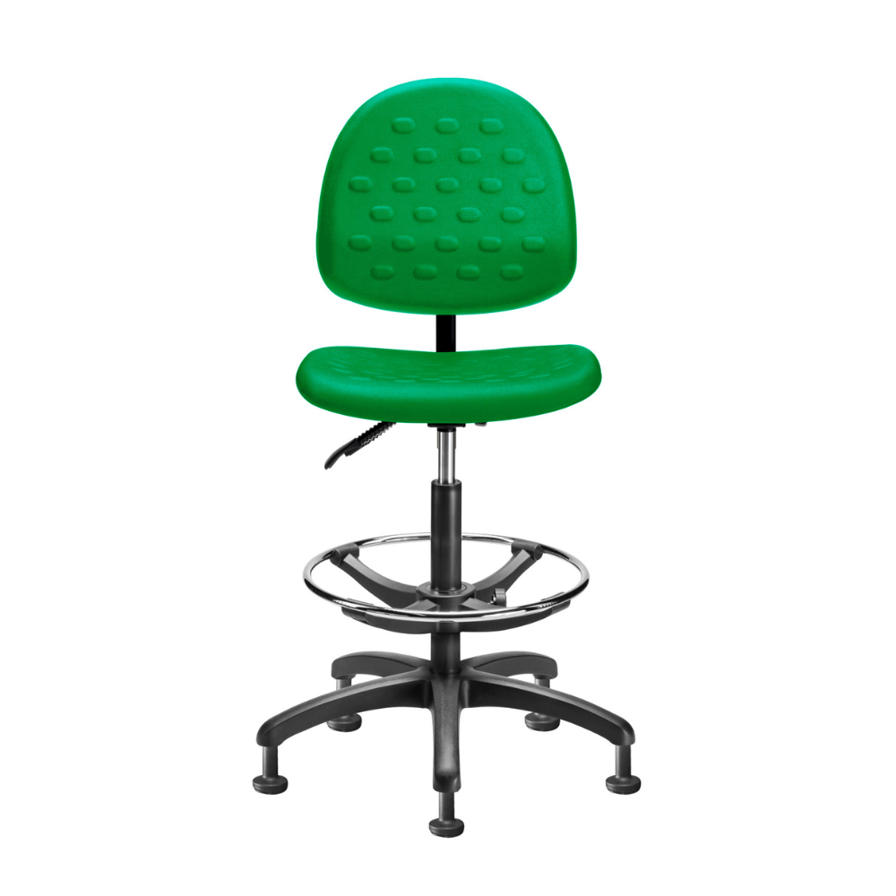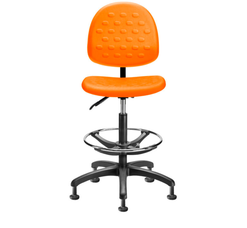 Silla giratoria 1950 A, respaldo y asiento moldeados de poliuretano tipo piel integral, mecanismo de reclinación de respaldo, ajuste neumático de altura, base de 5 anclas con regatones o rodajas y aro descansapiés.- Silla giratoria industrial/laboratorio/ensamble.
